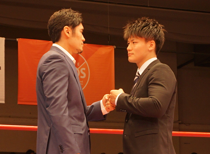日本S・ウェルター級チャンピオンでIBF同級15位にランクされる井上岳志(ワールドS)が8月10日、後楽園ホールの「ダイヤモンドグローブ」で、同級1位の長濱陸(白井・具志堅S)と初防衛戦を行うことになった。井上と長濱が8日、「ダイヤモンドグローブ」が行われた後楽園ホールのリングで発表した。