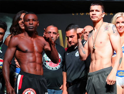 同じリングでWBA世界S・バンタム級“スーパー”王者ギジェルモ・リゴンドウ(キューバ)が同暫定王者モイセス“チュキー”フローレス(メキシコ)と防衛戦。計量でリゴンドウは121.5ポンド(55.11キロ)、フローレスはリミットの122ポンド(55.34キロ)をマークし合格。フェイスオフするとフローレスの長身(175センチ)が目立ち、リゴンドウ(162センチ)は苦戦も予想する声も聞かれる。Photos/Tom Hogan–Hoganphotos