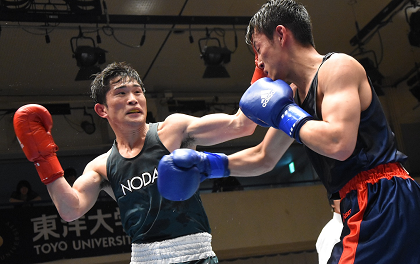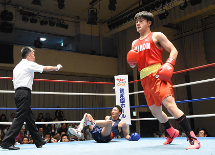 日大はこの日、軽量級でいきなり4勝を上げた後、ライト級2試合を落としたものの、L・ウェルター級の李健太が葦津航に5-0判定勝ちした時点で9人対抗の5勝目となり、対東洋大の勝利が確定した。