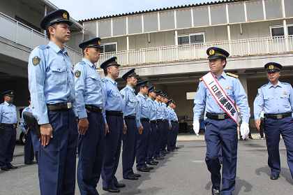 3階の講堂で50人の署員を前に訓示を行った。「城陽市民7万6000人の安全を守るため汗をかいていただき感謝しています」と語り、「私の現場はリング上です。お客さんとセコンドと一心同体で戦っているので孤独ではありません。みなさんも、城陽市民という応援団や同僚、上司というセコンドが居ることを忘れないで、悪者には勇気をもって戦ってください」と署員を激励した。