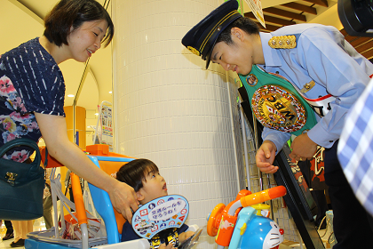 この後、1日署長のたすきをかけ、市内の商業施設で買い物客に特殊詐欺防止などを呼びかけるチラシ、自転車盗難防止ワイヤー、うちわなどを配布した。「わぁ、可愛い顔してはるね」と女性客からスマホを向けられるなど人気を集めていた。