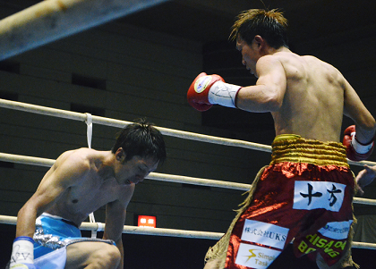 巻き返しを図った久田は6回から前に出て、ボディを攻めて角谷を後退させた。7回、青コーナーに詰めて、強烈な左フックを角谷の顔面にヒット、ダウンを奪った。8回は久田が角谷にロープを背負わせて連打。2分54秒、角谷が棒立ちになったところで、主審が試合を止めた。久田は劣勢を気迫で盛り返した根性勝利だった。