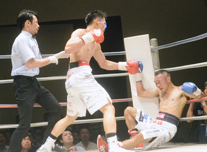 大阪・住吉区民センターのセミで行われたOPBFバンタム級タイトルマッチは劇的な展開に─。王者マーク・ジョン・ヤップ(六島)が初回に3度のダウンを奪われながら、前日本同級王者の益田健太郎(新日本木村)に4回2分59秒TKO勝ち。WBC世界同級7位につけるヤップが、WBC同級9位の益田との世界ランカー対決を制した。