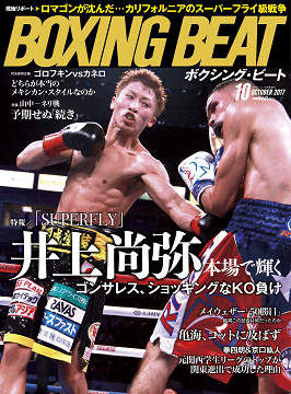ボクシングビート最新10月号が15日、全国の書店にて発売となりました。先ほどアメリカ・デビューを飾った井上尚弥が目印です。今月号はその井上含め、衝撃のローマン・ゴンサレスvsシーサケット・ルンビサイ等、S・フライ級戦争を巻頭特報しております。