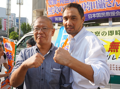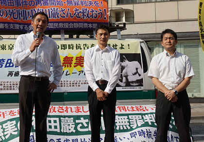 袴田さんは14年3月、静岡地裁の再審開始決定を受けて釈放、48年間の獄中生活を終えたが、検察側が即時抗告したため、現在も裁判は継続中。26、27の両日は、静岡地裁決定の決め手となったDNA鑑定について、鑑定人尋問が2日にわたって行われるため、これに合わせたアピール活動だった。