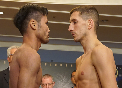 比嘉はリミットを100グラム下回る50.7キロ、5月の世界初挑戦でフアン・エルナンデス(メキシコ)が体重超過で失格となったこともあり、関係者は「まさか今回も…」とやきもきしたが、挑戦者トマ・マソン(仏)は50.6キロで無事あすの試合に進んだ。