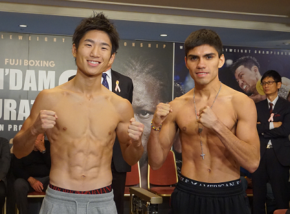 拳四朗と挑戦者ペドロ・ゲバラ(メキシコ)はともにリミットを200グラム下回る48.7キロで計量に合格。拳四朗はフェイスオフでもしばらくニコニコ顔だったが、なんとか真面目な顔を作って乗り越えた。