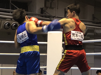 王子工高の高校8冠コンビは快勝。小林和真(日大)と対戦した今永は3Rに左ストレートを立て続けに決めて3R43秒ABD勝ち。荒本は三谷将太(日大)を開始から右ストレートで圧倒して1R2分53秒ABD勝ちした。