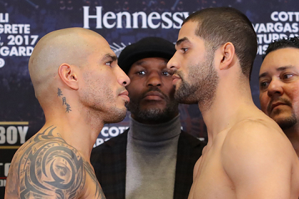 同じリングで行われるWBC世界S・バンタム級タイトルマッチは、王者レイ・バルガス(メキシコ)が121.4ポンド(55.07キロ)、挑戦者のオスカル・ネグレテ(コロンビア)が121.2ポンド(54.98キロ)でリミット122ポンドをクリア。バルガスは2度目の防衛戦となる。Photo:Tom Hogan- Hoganphotos/Golden Boy Promotions