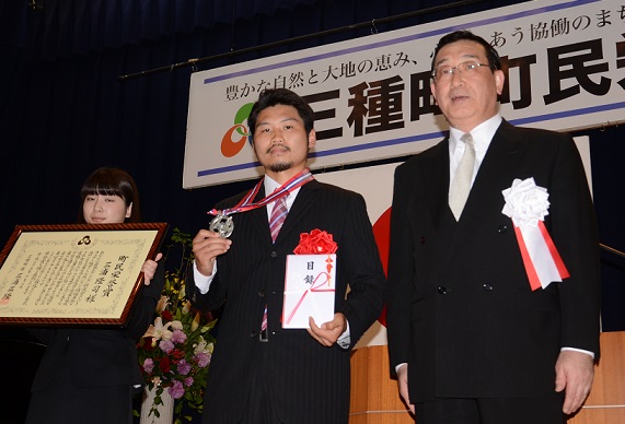WBC世界S・フェザー級チャンピオンの三浦隆司(帝拳・29)が2日午後郷里の秋田県三種町で町民栄誉賞を授与された。