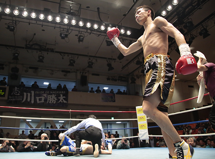 船井はやや力みが見られたが、2回終盤、右カウンターを決めると川口のヒザがガクリと崩れる。船井が追撃し、右を打ち下ろすと川口がキャンバスにダイブ。立ち上がろうとしてフラついたところでストップとなった。