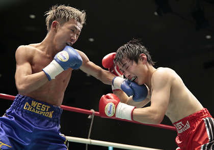 初回、西軍代表決定戦MVPのサウスポー森がワンツーを打ち込むと、陸が左フックを合わせた。森の踏み込みはスピードがあるが、陸の反応も速い。互いに警戒心の強い立ち上がりとなったが、3回に陸の右が浅く2度ヒット。しかしラウンド終盤に陸の右の打ち終わりに、森が右フックを合わせて陸がスリップ気味ながらダウンした。