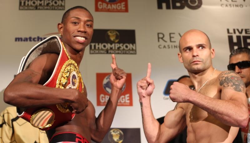 S・バンタム級は王者ジョナサン・ロメロ(コロンビア、23勝12KO無敗)、挑戦者キコ・マルティネス(スペイン、28勝20KO4敗)とも121.5ポンド(55.11キロ)を計測。ロメロは2月、決定戦で獲得したベルトの初防衛戦。元欧州王者マルティネスは今回が世界王座初挑戦。Photos/BoxingScene.com