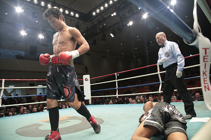 チャンピオン末吉が左ジャブを効果的に使って滑り出した試合。しかし3回に訪れた最初のダウンシーンで、倒れたのは末吉のほうだった。大里の右ストレートがカウンター気味に決まり、ロープ際に崩れたのだ。