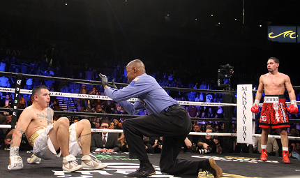 ガルシアの見事な一撃TKO劇だった。試合は予想通り、プレスをかけるリオスにガルシアがボクシングを心がける展開で進行。5回終了間際、両者はパンチの応酬でエキサイトする。
