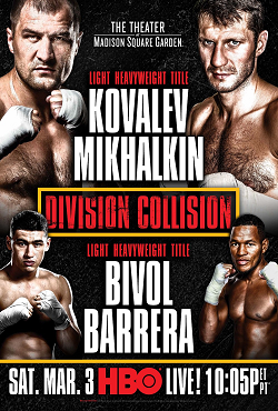 アンドレ・ウォードに連敗後、昨年11月、ウォードの引退で空位になった王座を決定戦で獲得したコバレフ(31勝27KO2敗1分)が無名のミハルキン(21勝9KO1敗)に対して賭け率20-1で有利と出ている。