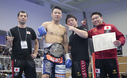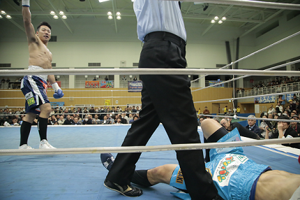 圧巻の戴冠劇だった。ジャブの差し合いから、フィニッシュまではわずか90秒。低い姿勢でガードを高く構える西田に対し、竹迫が右アッパー、左ボディブローを打ち込むと、これが効いて西田が後退。すかさず竹迫が襲い掛かり、右を打ち下ろすと、まともに食らった西田がキャンバスに大の字。主審がノーカウントで試合を止めた。