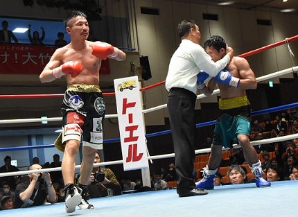 2回以降も近距離の攻防が続き、36歳のベテラン大竹はボディ打ちと右ショートで優位に立つ。早くも息の上がる26歳のロベターニャもラフなパンチを振り回して対抗するが、大竹のボディ攻撃を食らって苦しい。4回終了時の採点は、39-37、40-36×2で大竹がリードした。