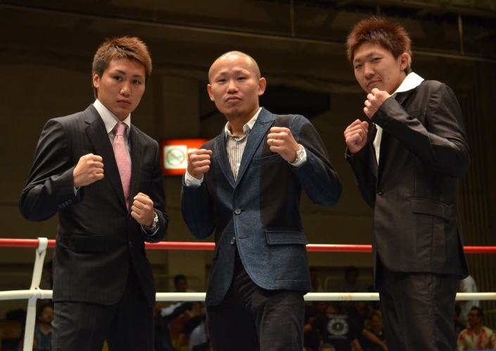 | 移籍を発表した小國(左)と阪下(右)。中央は日本王者の加藤 |