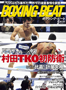 今月のボクシング・ビート(5月号)が19日発売となりました。表紙は先日のWBAミドル級戦。王者村田諒太がブランダムラを右フックでダウンに追い込むシーンです。この村田戦と比嘉大吾戦を巻頭でリポートしています。