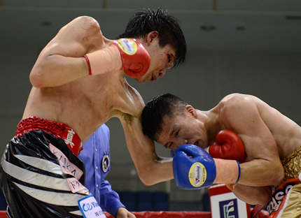 注目の実力者対決、序盤をリードしたのはWBAフェザー級7位の久保。脚もよく動き、サウスポースタンスから左ストレートをうまく当てて、2回早くも大沢が鼻血を流す。前世界チャンピオンが主導権を一度は握った。