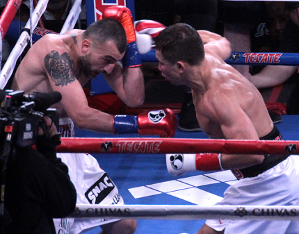 再開後のゴロフキンはもう試合を決めに出ており、右フックでロープを背負わせると、左ジャブでセットアップ、そして右を打ち込んで挑戦者をキャンバス へ。倒れたマルティロスヤンはダメージが深く、レフェリーの10カウントを聞くほかなかった。