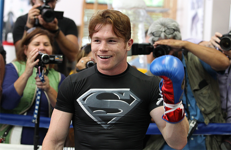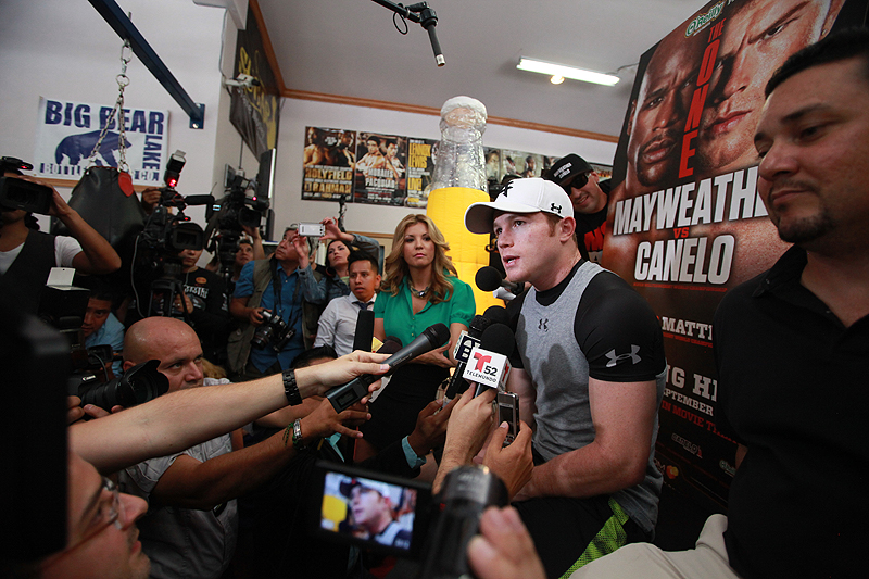 場所はここ数試合カネロがトレーニングを敢行しているシェーン・モズリーの別荘兼ジム。主人モズリーも顔を出し、カネロのプロモーター、オスカー・デラホーヤ氏も出席。愛弟子カネロの宣伝に余念がなかった。
