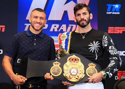 WBAはこの試合の勝者にリニューアルした特製ベルトを贈呈する。今後デザインが変わったこのベルトが一般的になるかは不明。リナレスが保持するリング誌ライト級王座も争われる。Photo:Mikey Williams/Top Rank