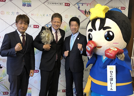 伏見市長は「枚方での初防衛戦開催を期待しています。枚方市をもっとPRしてください」と激励。本石会長は「8月11日の試合は矢田だけでなくジムの期待の選手が多数出場します。小中高校生と体の不自由な方の入場は無料にしてボクシングで枚方市を盛り上げていきます」と抱負を語った。