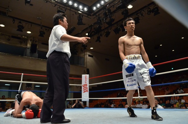 初回、日本S・フライ級2位の船井が右ストレートをボディに打ち込むと、長身のナラクがうずくまった。テンカウントがむなしくコールされた。船井は19勝13KO6敗。19歳のナラクは8勝2KO7敗1分。