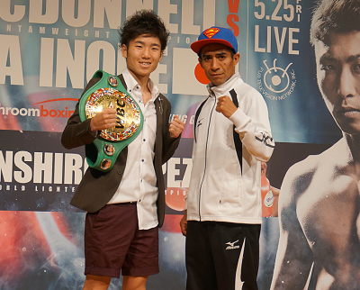 25日に迫ったダブル世界タイトルマッチの記者会見が23日、東京ドームホテルで開かれ、WBA世界バンタム級王者ジェイミー・マクドネル(英)、挑戦者の井上尚弥(大橋)、WBC世界L・フライ級王者の拳四朗(BMB)、挑戦者ガニガン・ロペス(メキシコ)が出席した。