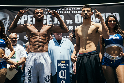 明日16日(日本時間17日)米テキサス州ダラス近郊フリスコのフォードセンター・アット・ザ・スターで挙行されるIBF世界ウェルター級タイトルマッチの計量が15日行われ、王者エロール・スペンスJr(米)が146ポンド3/4(66.56キロ)、挑戦者2位カルロス・オカンポ(メキシコ)が146ポンド1/2(66.45キロ)をマーク。リミット147ポンドを合格した。
