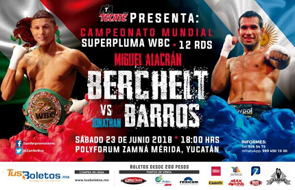 23日(日本時間24日)メキシコ・ユカタン半島のメリダで挙行されたWBC世界S・フェザー級タイトルマッチは、王者ミゲール・ベルチェルト(メキシコ)が挑戦者ジョナサン・ビクトル・バロス(アルゼンチン)に3回TKO勝ち。3度目の防衛を果たした。
