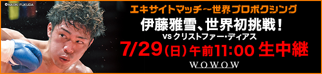 この注目の一戦、WBO世界S・フェザー級王座決定戦「伊藤雅雪vsクリストファー・ディアス」は、7月29日(日)午前11時からWOWOWライブで生中継される。