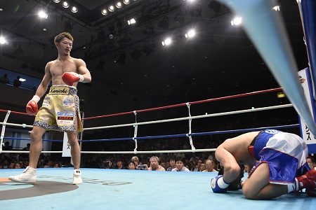 及川は前に出てプレスをかける渡邊をさばきながら的確にパンチをヒットさせた。上下の打ち分けも理想的で試合はワンサイド。4回のゴングと同時に及川がラッシュしたところでレフェリーストップとなった。