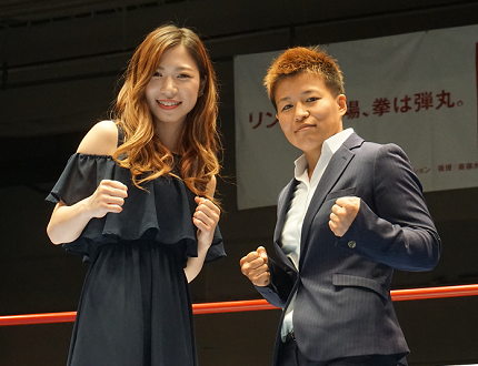 セミの前に、9月29日に後楽園ホールで行われるIBF女子世界アトム級王座決定戦で拳を交える黒木優子(YuKOフィットネス)と花形冴美(花形)がリングイン。試合に向けた決意を表明した。