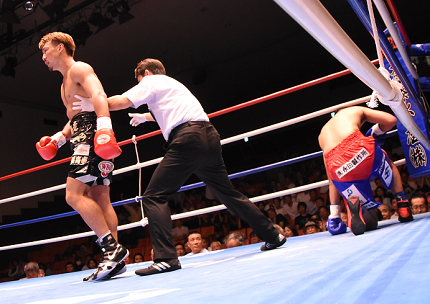 渡部がボディから打ち込んでいくと、丸木がコーナーに後退。渡部の猛打でたまらず丸木がひざをついてダウンとなった。ここは何とか立ち上がった丸木だったが、再びコーナーに追い詰められると、主審が試合を止めた。