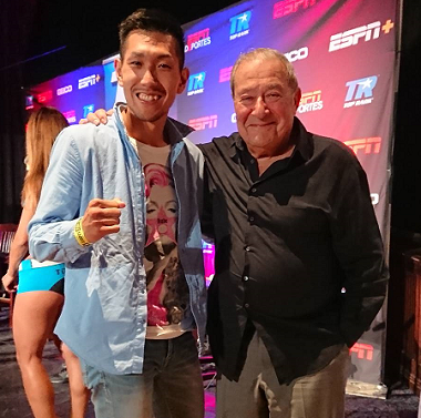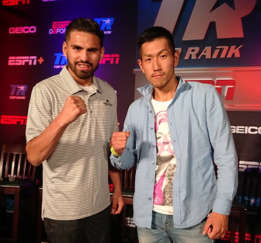 クリスチャン・ラファエル・コリア(亜)とのS・ライト級10回戦に臨む岡田は同門の日本王者、細川バレンタインの通訳で記者会見をこなし、3年契約をかわしたトップランク社のボブ・アラムCEO、次戦で挑戦する可能性のあるWBC同級王者ホセ・カルロス・ラミレス(米)と写真におさまるなど、アメリカで初めての記者会見を楽しんだ様子だ。