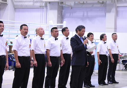 前会長の「判定疑惑」がスキャンダル化したこともあり、この日は異例の儀式も。競技開始前、選手宣誓の後審判団が勢ぞろいし、代表して小坂則夫審判委員長が「公平で公正な大会運営を誓う」と宣誓を行った。
