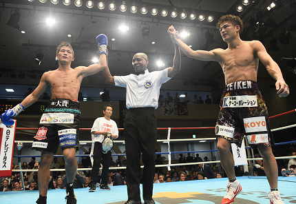 6日の後楽園ホール「第577回ダイナミックグローブ」メインイベント、OPBF&日本S・フェザー級王座統一12回戦は、日本王者の末吉大(帝拳)とOPBF王者の三代大訓(ワタナベ)がともに譲らず三者三様のドロー。スコアは115-113、113-115、114-114。末吉は日本王座の3度目の防衛に、三代はOPBF王座の初防衛に成功した。