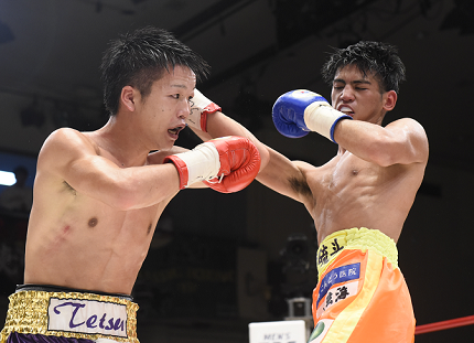 試合は初回から動いた。サウスポーのサミンギットに圧力をかける勅使河原はラウンド後半、左を外して右を打ち下ろすと、サミンギットがゆっくりとダウン。これは効いたかに見えたが、比人は立ち上がると反撃に出るガッツを見せた。