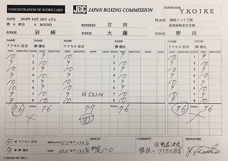 過去2度対戦して住吉の1勝(1KO)1分という両者は、ともに手の内を知っていることもあって互いに決め手を欠いた。最終回は頭をつけて打ち合って試合終了。スコアは76-76×2、77-76(住吉)だった。