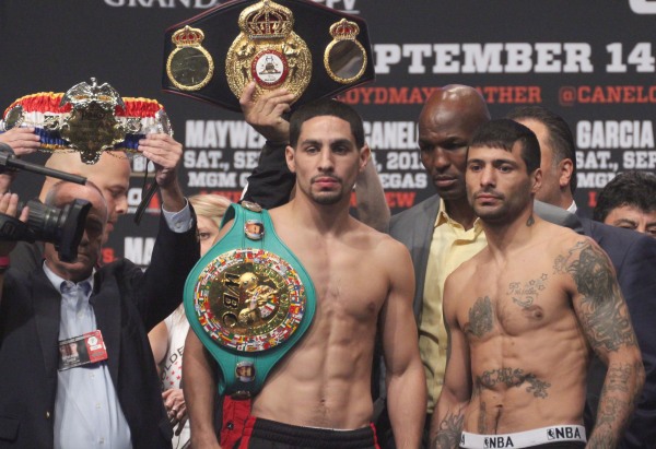 メイウェザー×アルバレス戦と同じリングで行われる注目のS・ライト級タイトルマッチ、WBC&WBA統一王者ダニー・ガルシア(米)×挑戦者ルーカス・マティセー(アルゼンチン)は計量で両者ともリミット140ポンド(63.5キロ)を計測した。