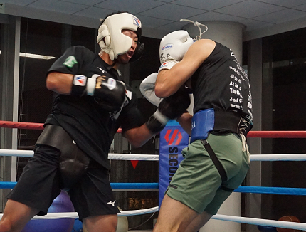 長身サウスポー、ペッチとの対戦に向けて招へいした岩佐とのスパーリング。拓真は、圧力をかける岩佐に対し、中間距離を保ちながら右ストレート、右アッパーをヒット。「岩佐選手のほうが(ペッチより)中間距離は絶対にうまい。当てることができて、いい練習になった」と充実の表情を見せた。