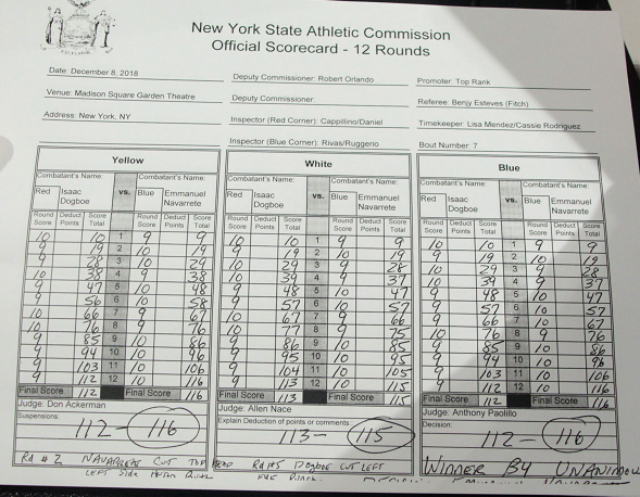 ドグボエは7、8回、連打で追い込みスコアを振り出しに戻したが、メキシカンは9回に息を吹き返し、ワイルドなパンチを繰り出し再びリード。両目が腫れた王者は終盤、劣勢を余儀なくされる。