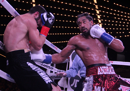 8回にも腹への攻撃でロシア人をコーナーへ送ったアンドラーデだが9回、アカボフが強打を返して反撃。王者にカバーリングを強いる。しかし10回、挑戦者は右目をカット。アンドラーデは左フック。ジャブでカットを悪化させる。