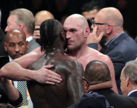昨年12月、試合後に健闘をたたえ合うワイルダー(左)とフューリー