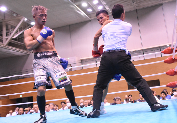 3回開始早々、田口が右を田中のテンプルに決めると、田中のヒザがガクリ。バランスを崩しただけのようにも見えたが、これには会場が沸いた。ここで田口は畳みかけたが、やはり田中のダメージは軽度で、左ボディで冷静に反撃した。