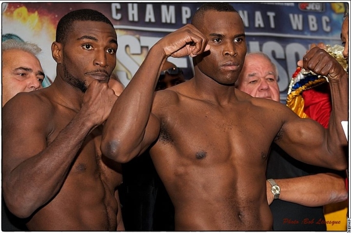 同じリングに登場する元WBC世界L・ヘビー級王者ジャン・パスカル(ハイチ=カナダ)は174.6ポンド(79.2キロ)。相手のジョージ・ブラデス(米)は5ポンド超の180ポンド(81.65キロ)もあった。そのほか世界ランカーのエレイデル・アルバレス(コロンビア=カナダ)、ダビ・レミュー(カナダ)らが出場。プロモーターは地元のイボン・ミッシェルとドン・キング・プロモーション。Photo/BoxingScene.com