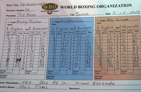 打たれても懸命にパンチを返し食い下がるドグボエだったが、効果は少なく右目のカットから出血。最終12回、連打でドグボエをロープへ詰めたナバレッテの追撃でガーナ人はダウン。起き上がるもチーフセコンドの父がタオルを投入した。
